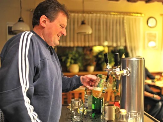 Vater und Sohn Herrmann legen selbst Hand an: beim Brauen, der Reifung und Lagerung des Bieres in den alten Gemäuern des Bierkellers oder bei der Hausschlachtung, die für die hervorragenden Spezialitäten des Hauses sorgt. Deswegen gehört die Schlachtschüssel auch zu den Pflichtterminen im Gourmet-Kalender. Im Sommer lockt der 500 Meter entfernte Biergarten.