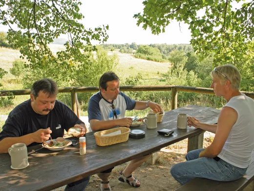 Freitags gibt es immer entweder Musik oder Forellen, Makrelen und Heringe vom Grill. Allein schon der Duft zieht die Fans regelmäßig auf die Anhöhe. Doch auch an normalen Tagen gilt die Lokalität als eine der schönsten der Region. Das Angebot wird durch ein kräftiges Kellerbier und delikate kalte Platten abgerundet. Dabei setzt Pächterin Gabi Schmidtlein auf eine kleine Laibaröser Landmetzgerei.