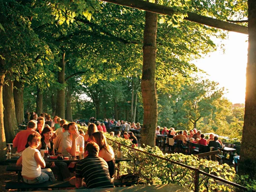 Der Ausblick vom St. GeorgenBräu-Bierkeller auf den Sonnenuntergang über Bamberg ist einmalig. Verwöhnt wird man mit Brotzeiten und warmen Gerichten, darunter Schäuferla, Haxen, selbstgebackene Brezen, Bohnakern und Dörrfleisch, hausgebackene Kuchen, Bauernbrot und Wurstspezialitäten aus der Region. Freitags gibts Makrelen und Heringe vom Buchenholzgrill.