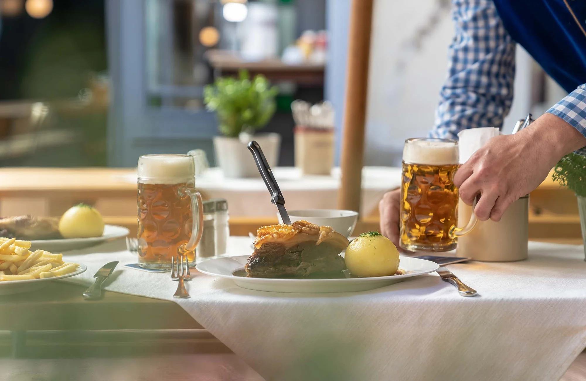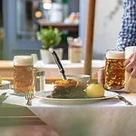 Fränkische Leberknödelsuppe, Schäuferla mit Sauerkraut und Kloß, Apfelkräpfla mit Vanilleeis inklusive ein Getränk nach Wahl (Änderungen vorbehalten) - Bamberger Spezialitäten