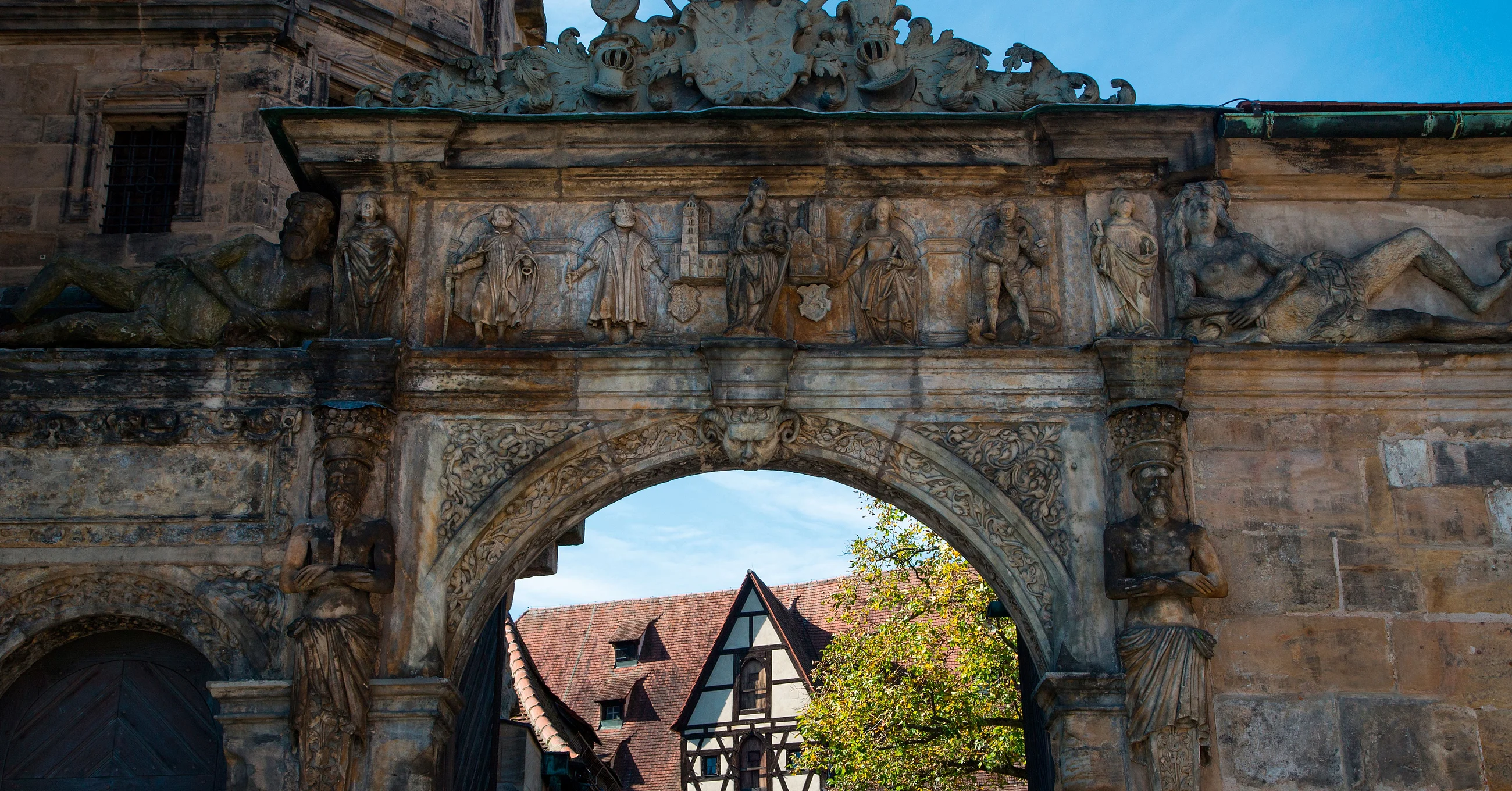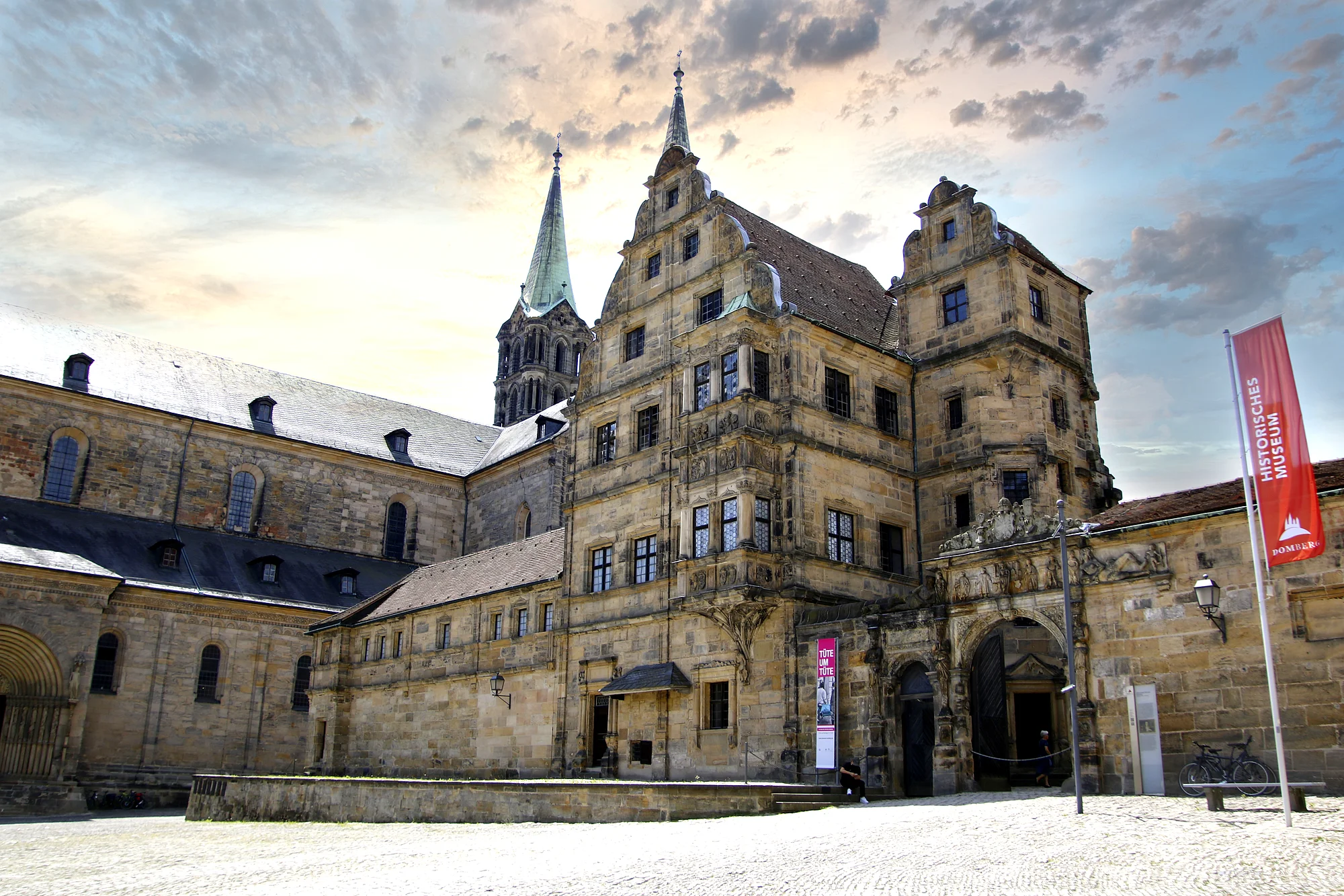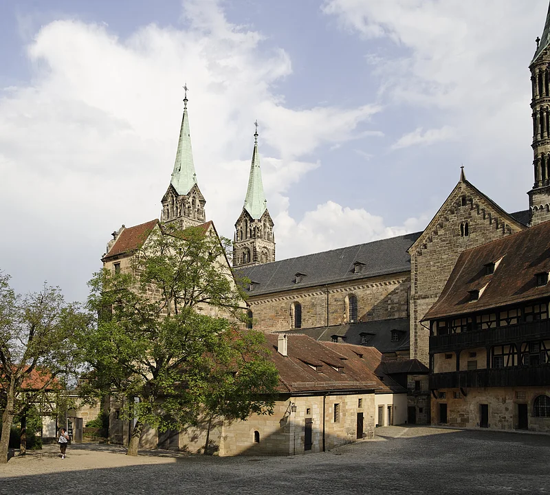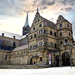 Vorläufer der Alten Hofhaltung war das Castrum Babenberg und die ehemalige Pfalz Kaiser Heinrichs II. Seit der Bistumsgründung 1007 war sie wohl auch Wohnsitz des Bischofs. Nach dem Dombrand von 1185 entstand an dieser Stelle ein eingeschössiger Pallas, der im 16. Jahrhundert durch einen prächtigen Bau im Stil der deutschen Renaissance ersetzt wurde. Eindrucksvoll ist die "Schöne Pforte" von Bildhauer Pankras Wagner: Sie zeigt in einem Relief die Muttergottes, die Heiligen Petrus, Georg, Kunigunde und Heinrich sowie die personifizierten Flüsse Main und Regnitz. Durch dieses Tor gelangt man in den romantischen, von Fachwerkbauten gesäumten Innenhof.