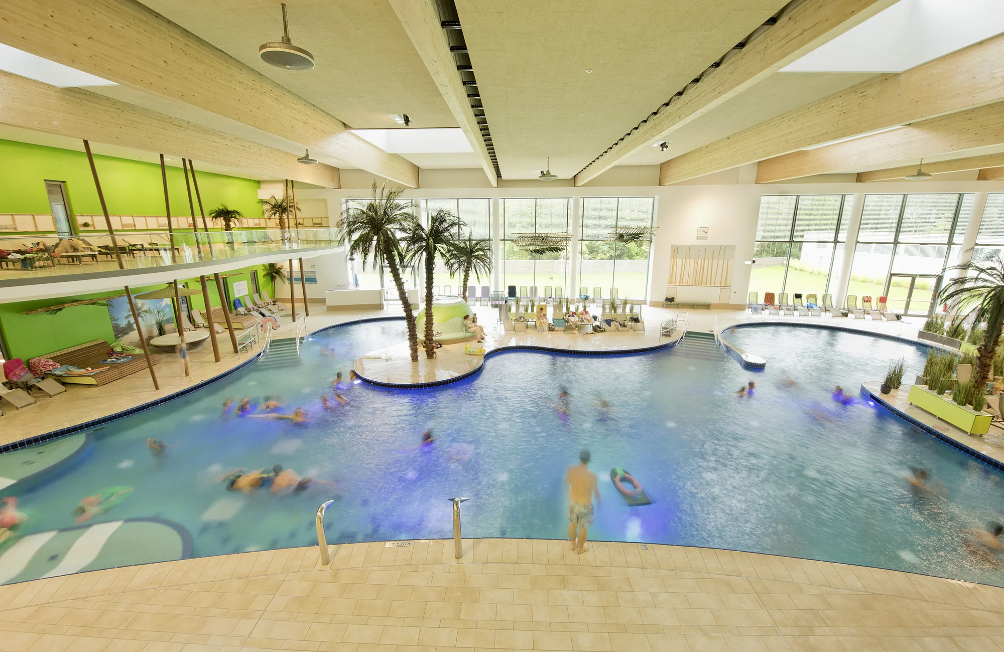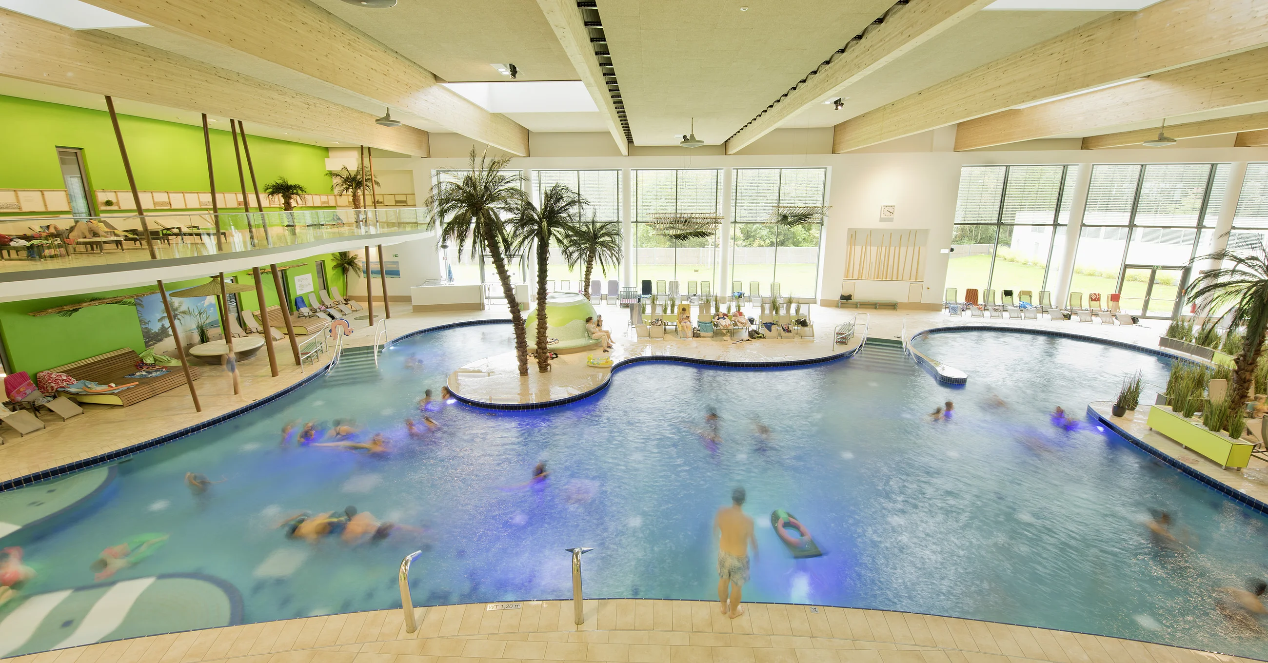 50m-Sportbecken, Kinderbecken, Freizeitbecken mit Strömungskanal, zwei Rutschen und Dachpool bedeuten puren Badespaß. Im Sommer verdoppelt das Freibad das Vergnügen und in der Sauna sorgen sechs Saunen, ein Whirlpool und ein Naturbadeteich für entspannende Abwechslung.