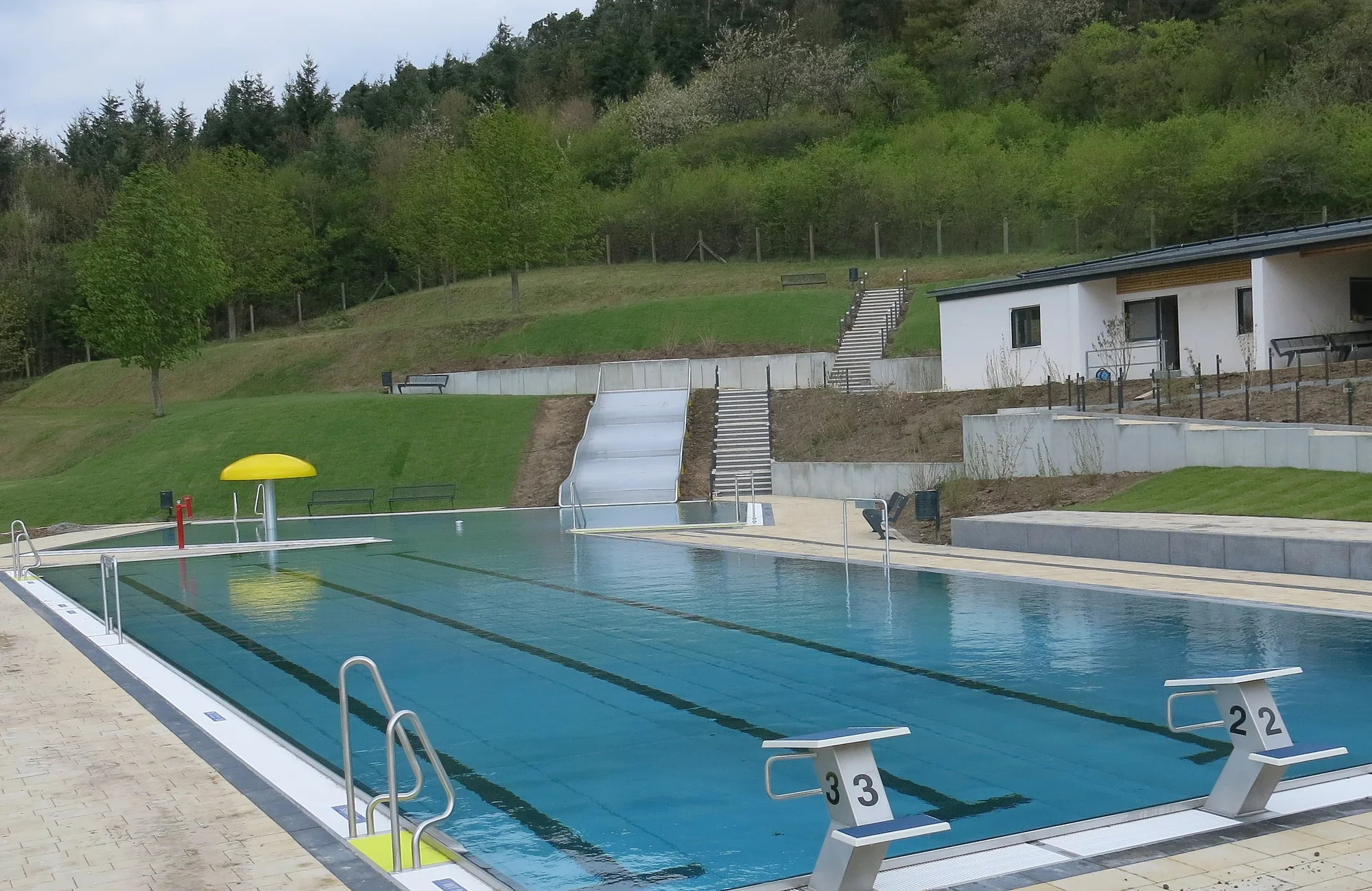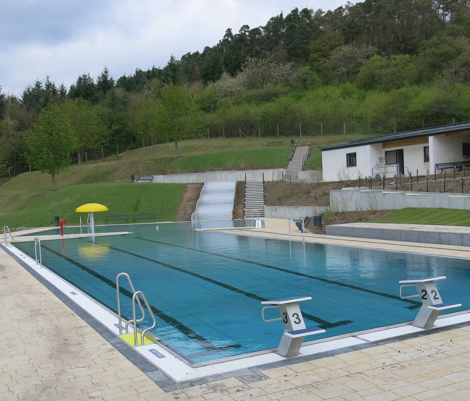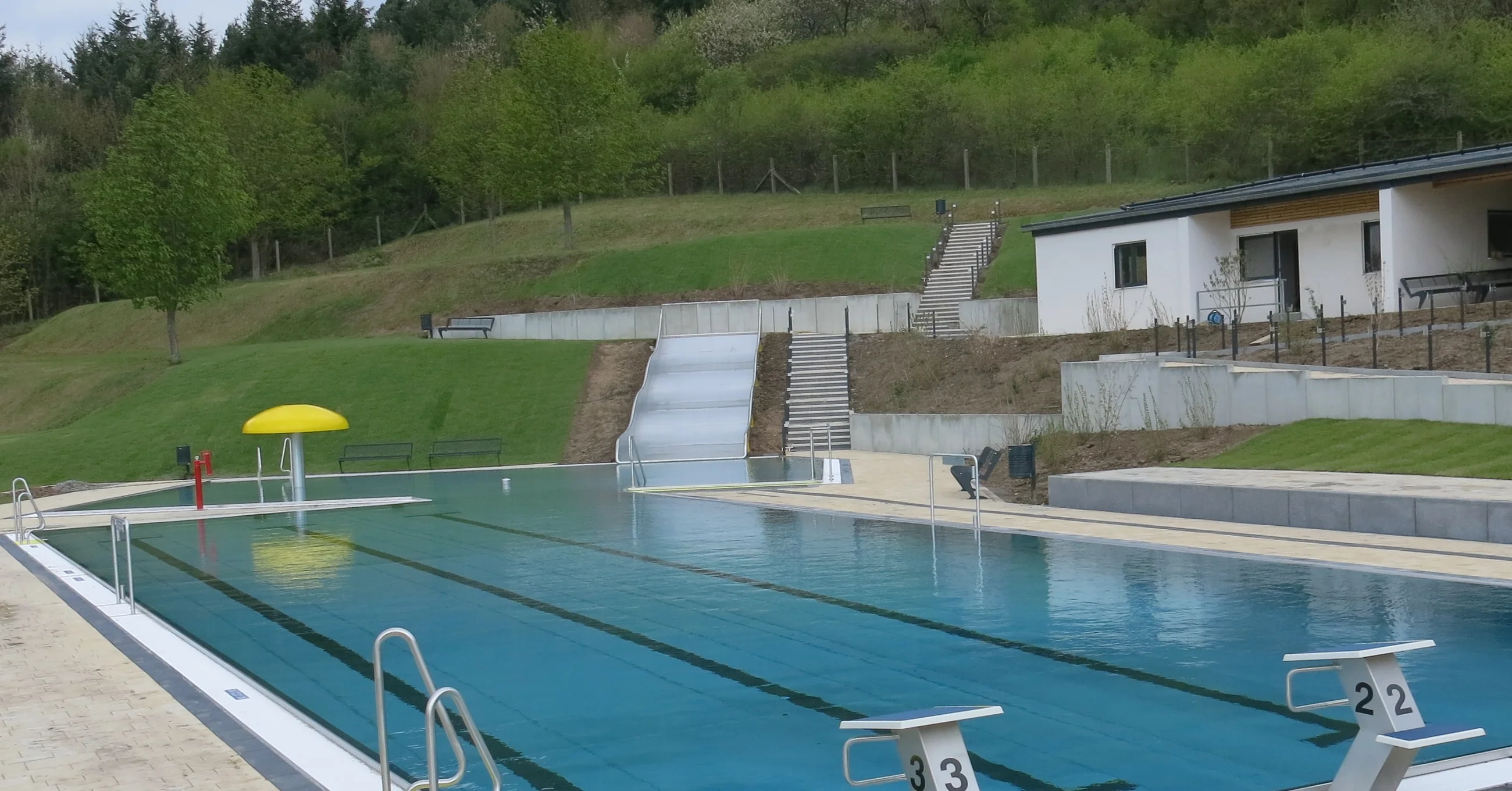 Gebaut 1971, generalsaniert 2016, 25-Meter Schwimmbecken mit vier Bahnen, anschließendes Nichtschwimmerbecken, plus Planschbecken, Wasserfläche 450 Quadratmeter; Besonderheiten: Hanglage, Bobbycarbahn, Kicker, Tischtennisplatte, Schiffchenkanal, Wasserkanonen, Wasserpilz und Wasserigel;