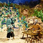 Material: aus Holz geschnitzte, bemalte Gliederfiguren mit Stoffbekleidung