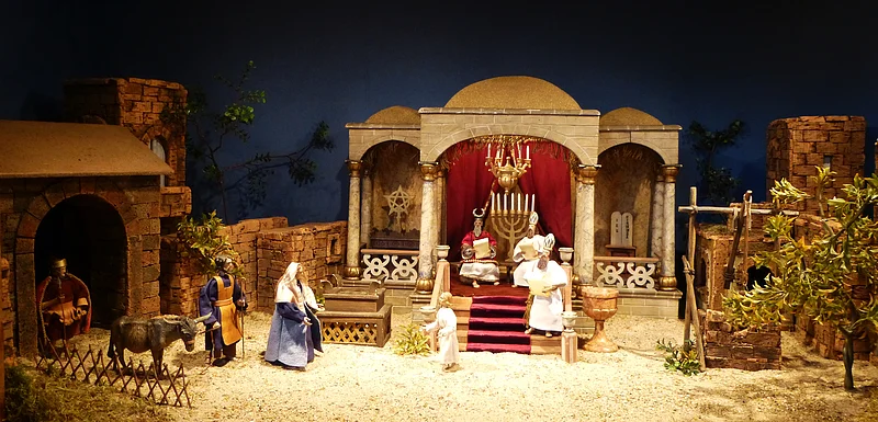 Zyklus der Krippenszenen: Verkündigung, Herbergssuche, Geburt/Heilige Nacht, Anbetung der Könige, Flucht nach Ägypten, Jesus im Tempel und weitere