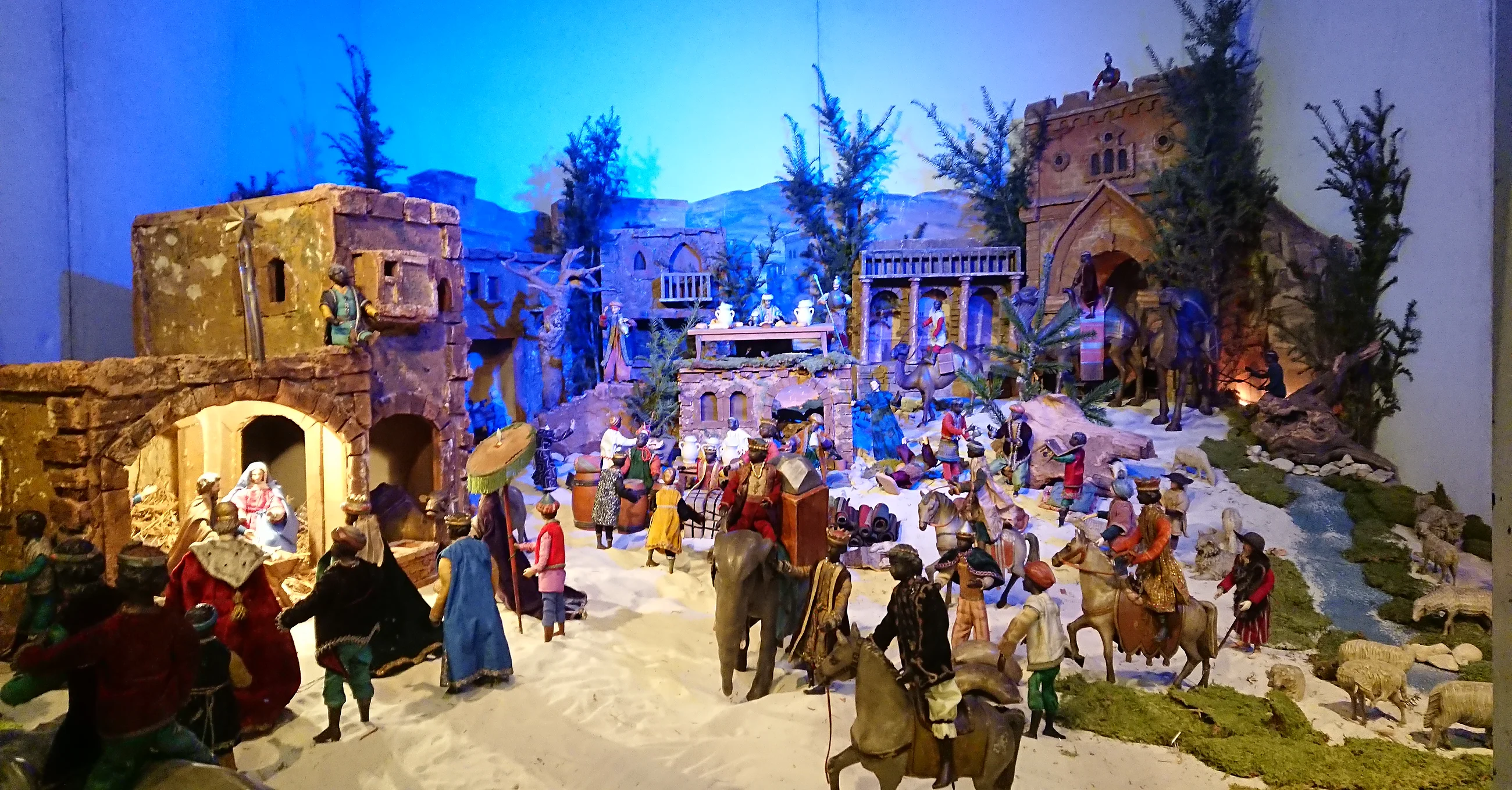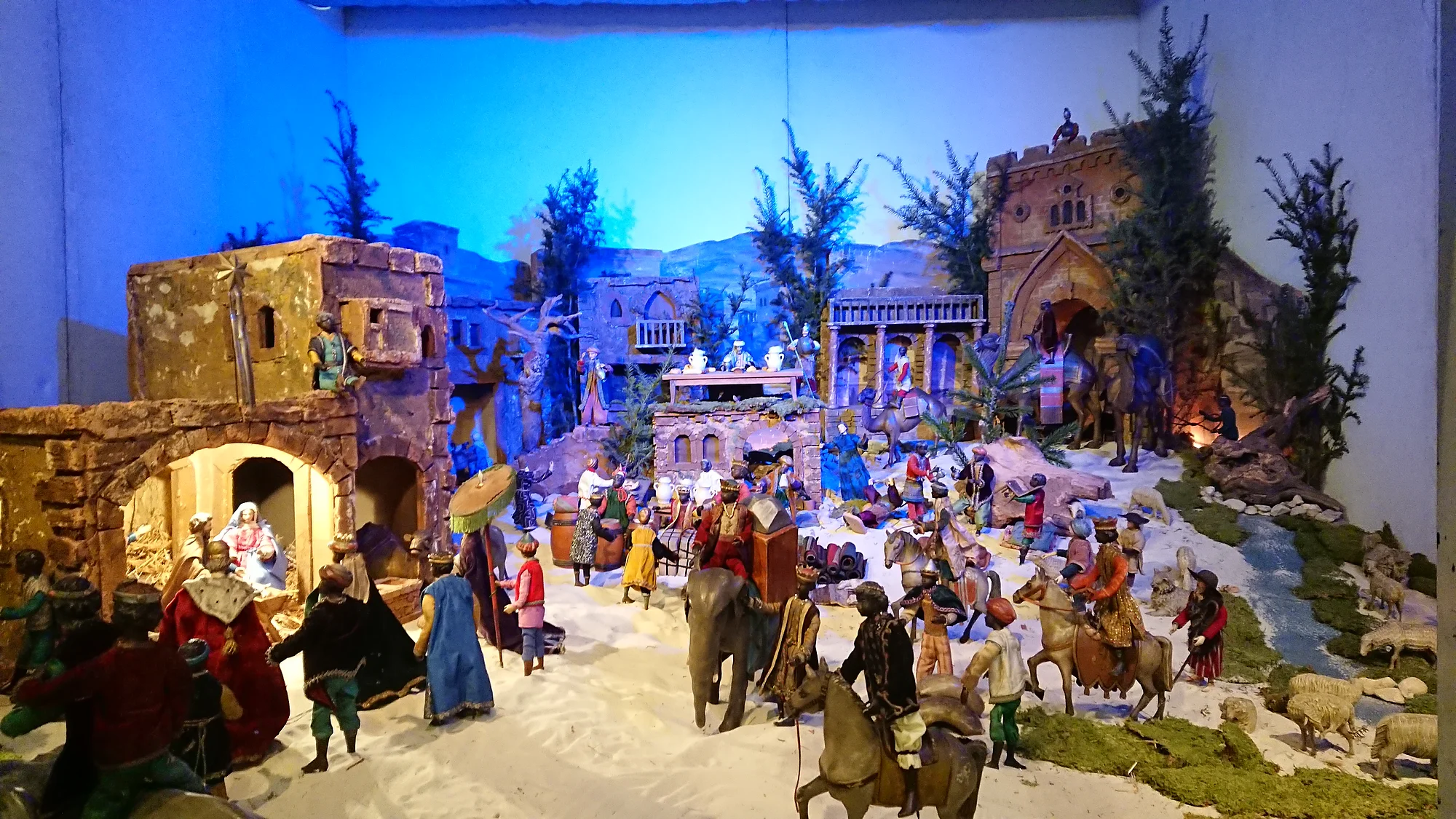 Letzte Bühnenkrippe Bambergs mit einer Breite von 4,00m und einer Tiefe von 4,55m. Sie umfasst inklusive der zahlreichen Tiere ca. 200 Figuren und einige sehr große Architekturteile, mit denen alle gängigen Szenen der Weihnachtsgeschichte und eine Vielzahl biblischer Szenen dargestellt werden können.