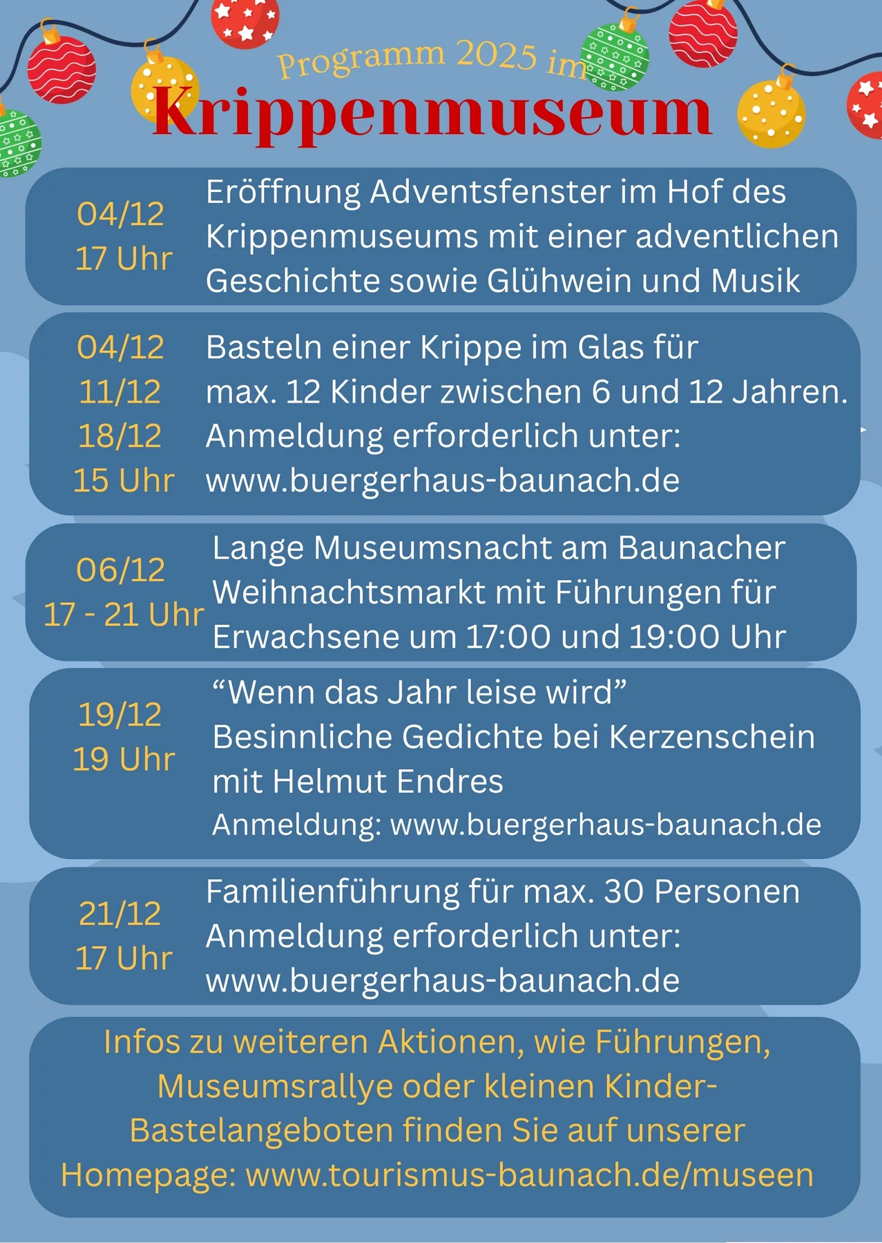 Entdecken Sie im Krippenmuseum Baunach ganz andere Askepte von Weihnachten. Dank der Vielzahl der Exponate in der Ausstellung erfolgt regelmäßig ein Wechsel in der Dauerausstellung, sodass die Besucher auch bei einem zweiten Besuch wieder neue Krippen bestaunen können. Im Gewölbekeller werden zudem passende Sonderausstellungen, zum Beispiel von Krippenfreunden und Kunsthandwerkern aus der Gegend, regelmäßig geplant.