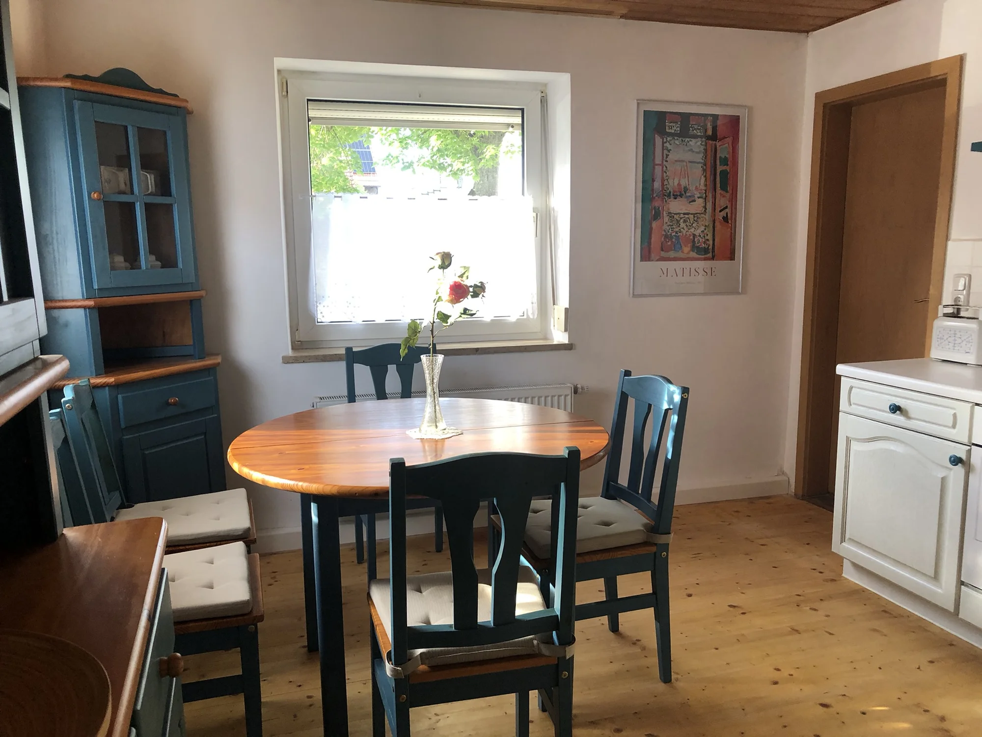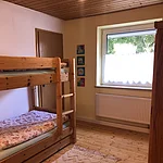Im Erdgeschoss finden Sie die Fewo Wiesenglück mit behaglichen Holzböden, einer geräumigen Küche, Wohnzimmer, zwei Schlafzimmern (das eine mit Doppel-, das andere mit Stockbett), einem hellen Bad und einer Terrasse hinter dem Haus.