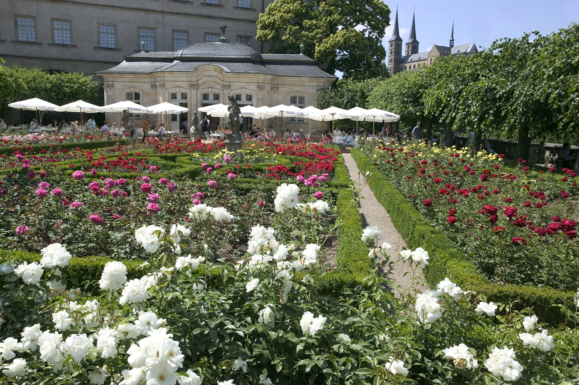 Der Rosengarten im Innenhof der Neuen Residenz glänzt nicht nur mit seiner Blütenpracht, sondern offenbart auch einen herrlichen Blick auf den Michaelsberg und über die Altstadt.