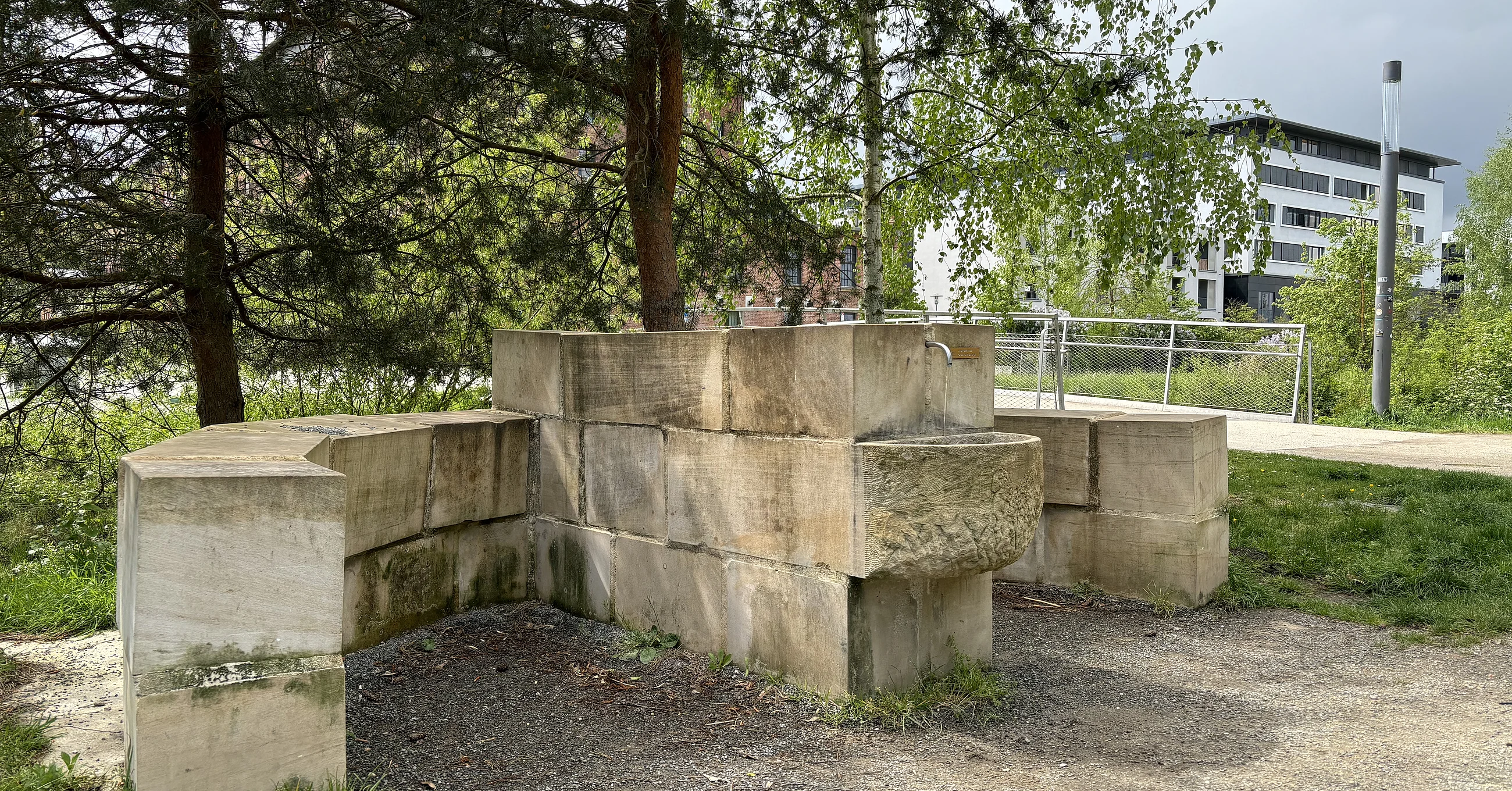 Der Trinkwasserbrunnen befindet sich auf der ERBA-Insel in direkter Nähe zum beliebten und belebten Spielplatz.