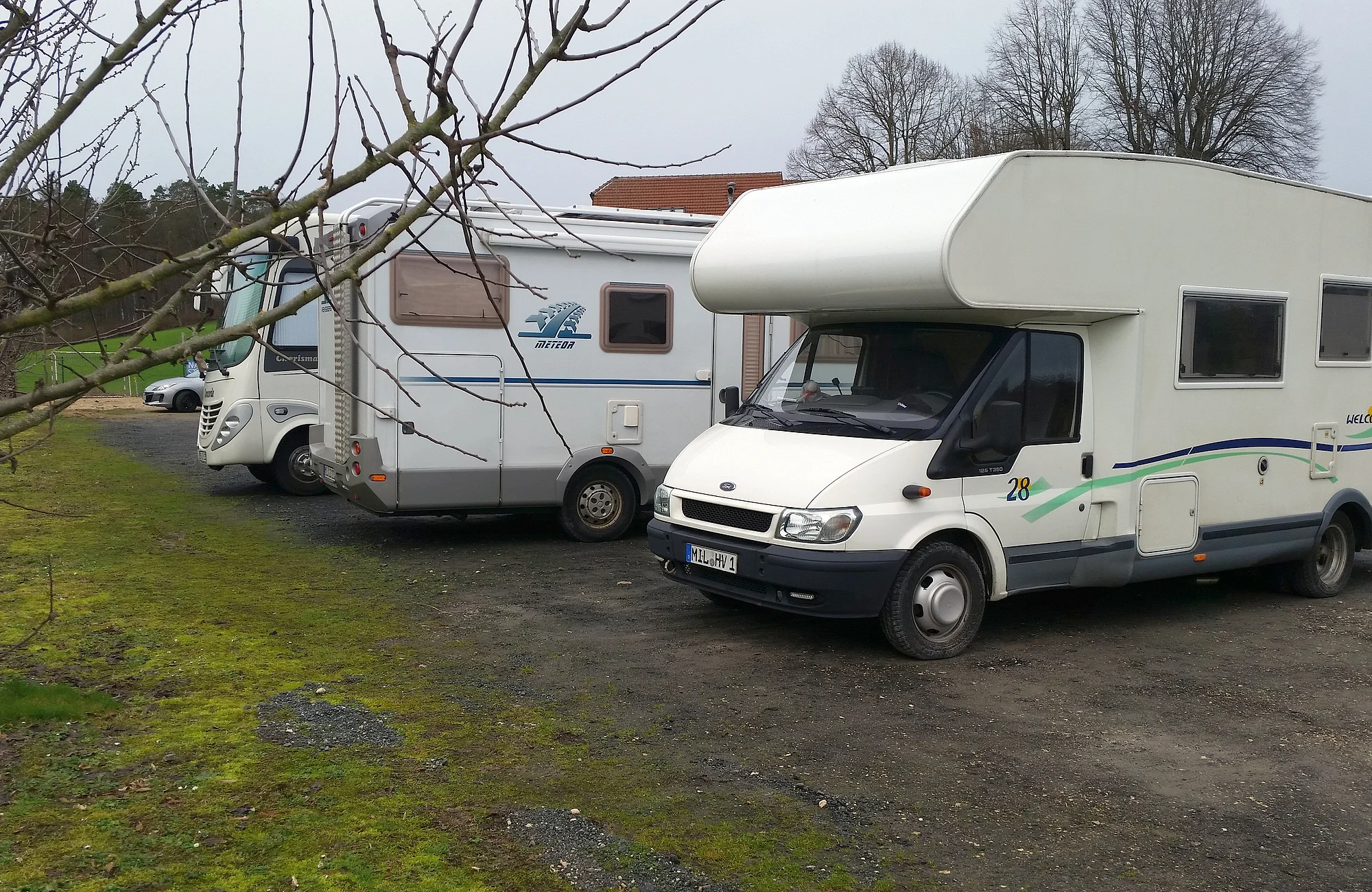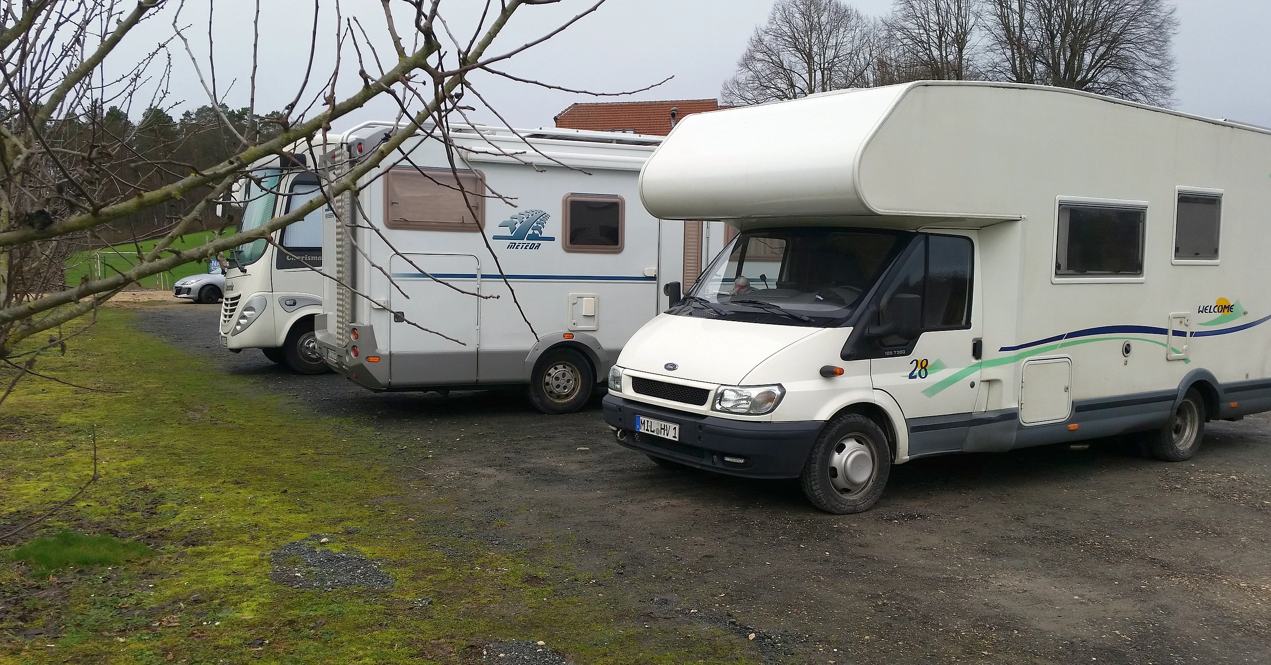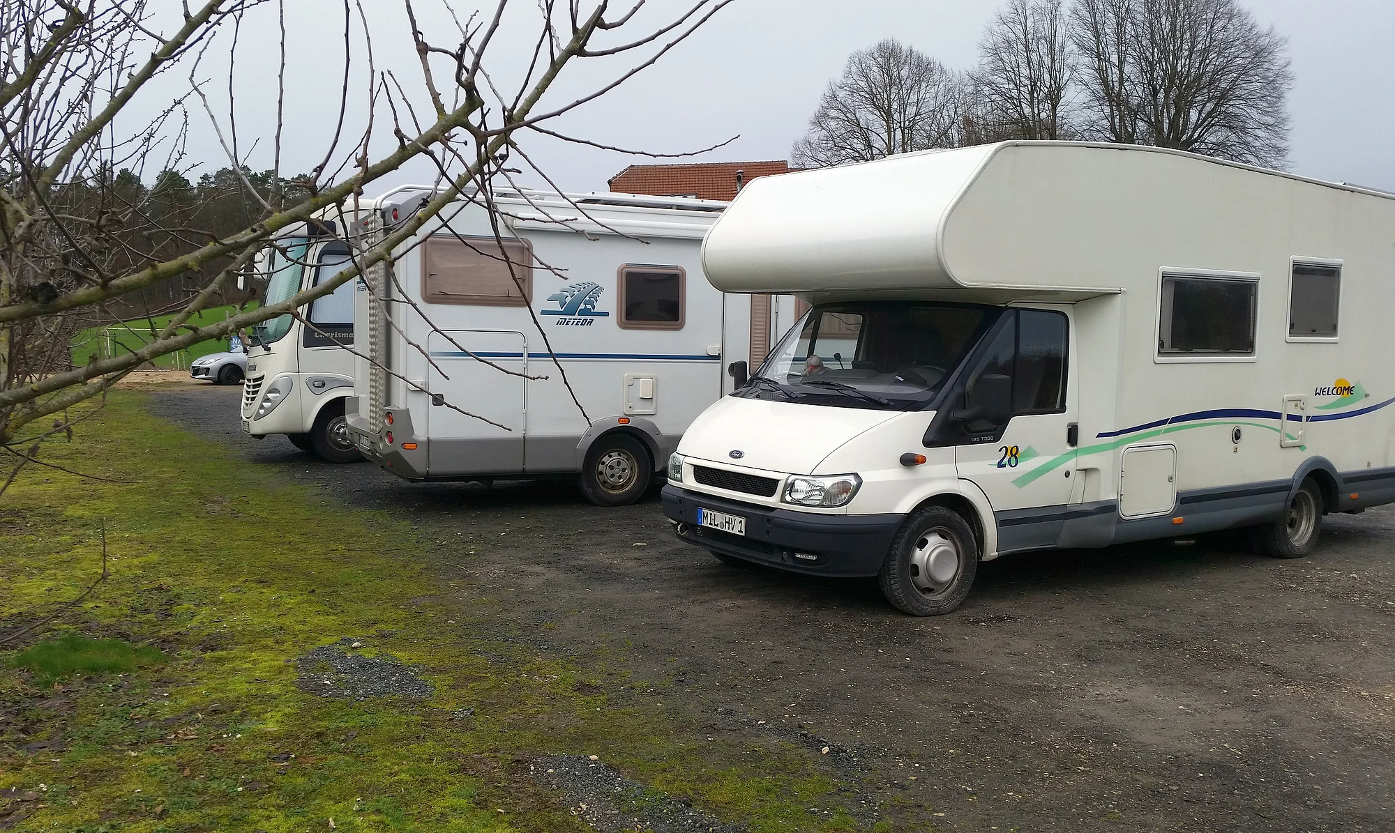 Gebührenpflichtiger Stellplatz außerhalb von Trabelsdorf, mit Stromanschluss, Frischwasser, Entsorgungsmöglichkeiten und einen Sanitärraum mit Dusche und Toilette.
