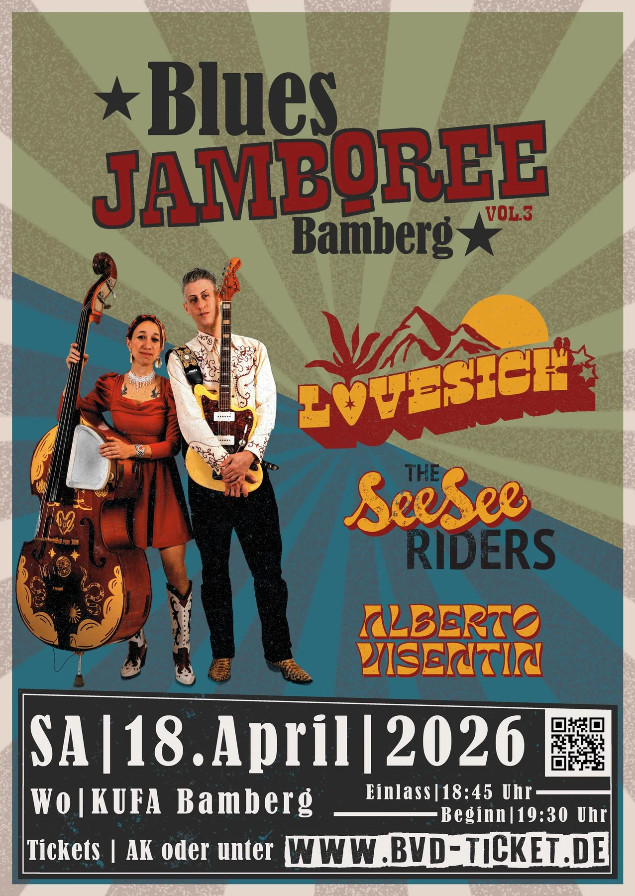 Hooray, das Blues Jamboree Bamberg geht in die dritte Runde! Nach zwei erfolgreichen Ausgaben wird nun das Blues Jamboree Vol. 3 am 18.04.26 erneut in der KUFA in Bamberg stattfinden. The See See Riders haben für dieses Jahr wieder Freunde aus Italien eingeladen: Lovesick aus Bologna und Alberto Visentin aus Venetien.