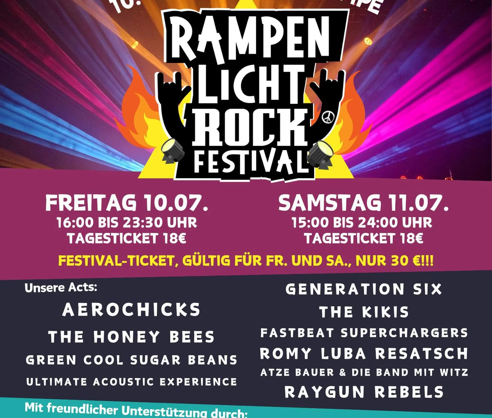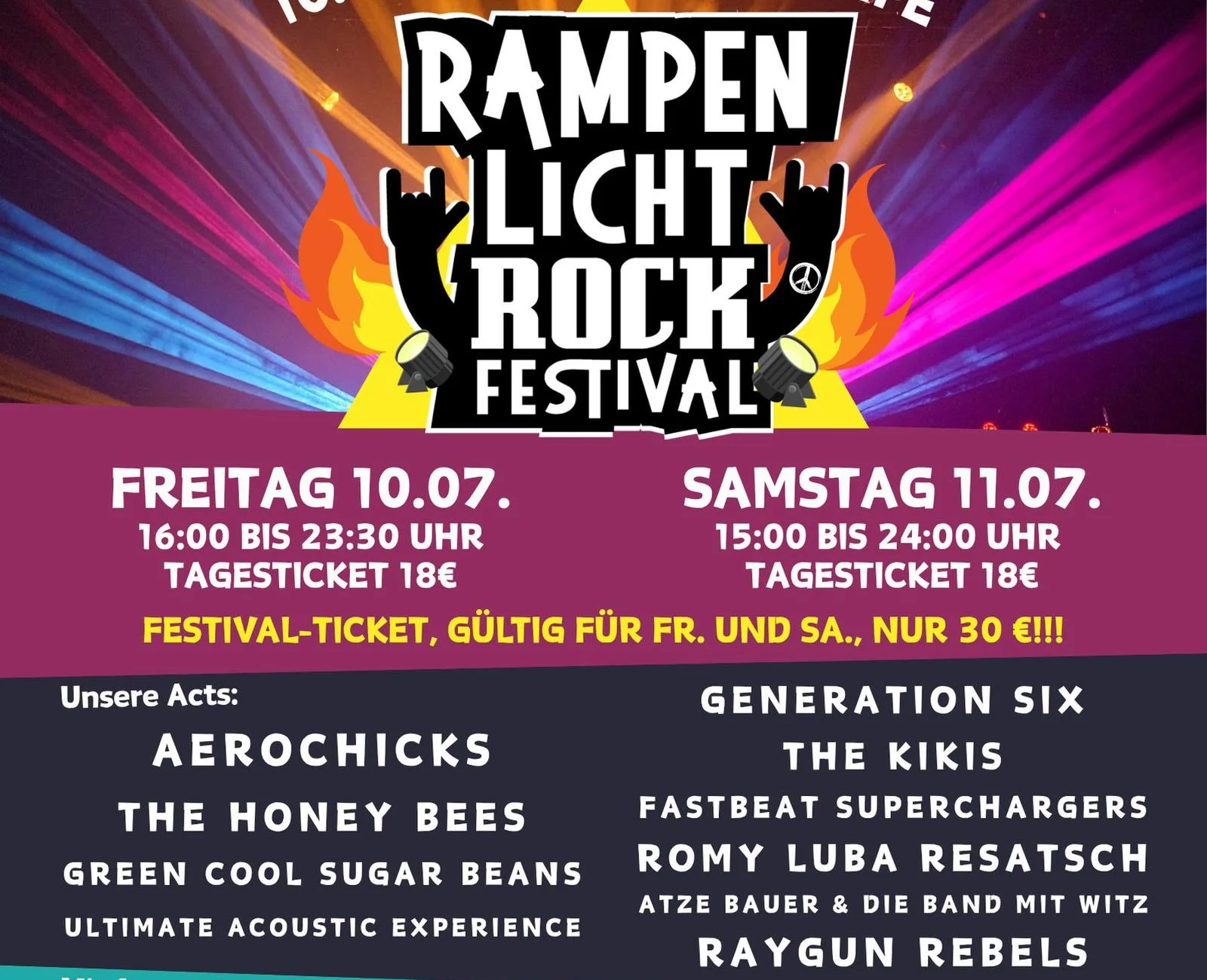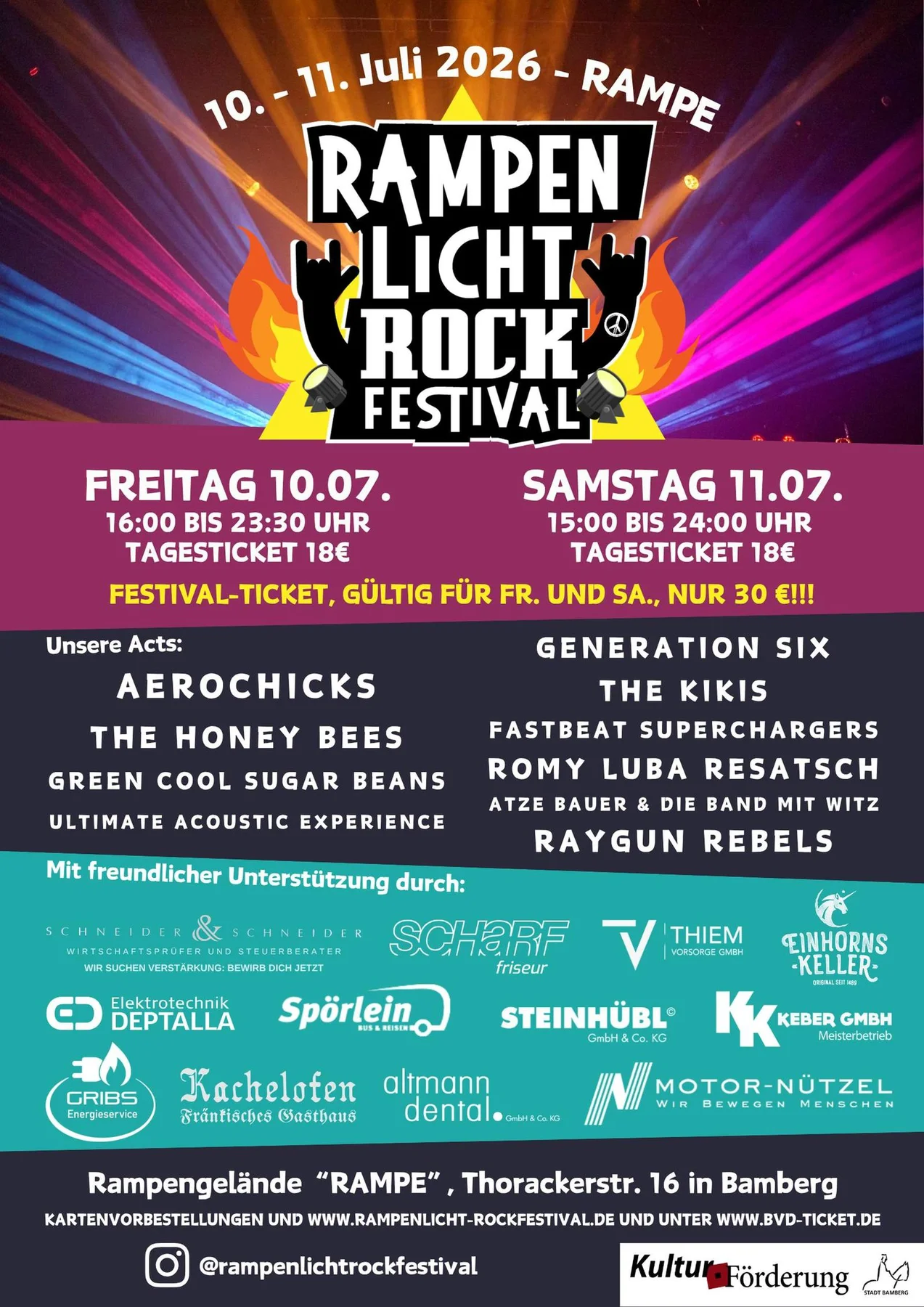 Das RAMPENLICHT Rockfestival bringt auch 2026 wieder zwei Tage 10. und 11. Juli 2026 Live-Rock nach Bamberg. Im Innenhof der ehemaligen Kultkneipe RAMPE treten lokale und regionale Bands gemeinsam mit überregionalen Acts auf und sorgen für eine abwechslungsreiche Mischung aus klassischem Rock, Alternative und modernen Gitarrensounds. Das Festival bietet insbesondere jungen Bands eine Bühne und trägt dazu bei, die lebendige Rock- und Livemusikszene der Region sichtbar zu machen. Viele der auftretenden Gruppen stehen hier erstmals auf einer größeren Bühne und erreichen ein neues Publikum. Mit bewusst niedrig gehaltenen Eintrittspreisen, kurzen Wegen und viel Nähe zur Bühne schafft das RAMPENLICHT eine offene Festivalatmosphäre mit entspannten Summer-Vibes. Zwei Tage Livemusik, gemeinsames Feiern und echte Festivalstimmung mitten in Bamberg.