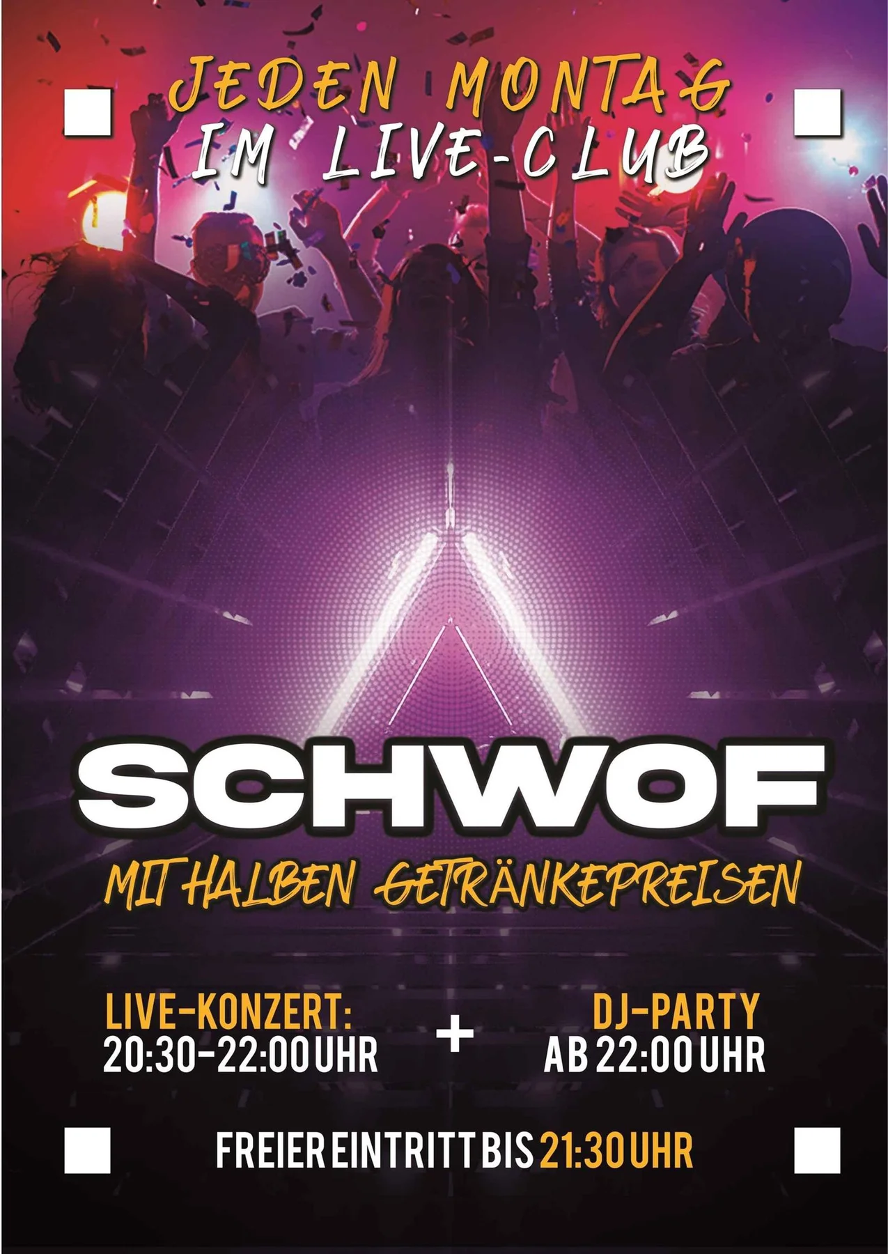 Ab 22:00 Uhr steigt der Schwof – seit bereits über 20 Jahren DIE Party in Bamberg. Wechselnde DJs zaubern mit einer perfekten Mischung aus Rock | Pop | Indie | Party eine prickelnde Stimmung. Das Beste Montags - alle Getränke kosten nur den halben Preis!